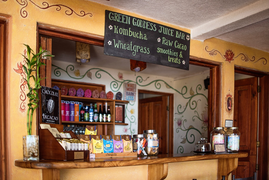 Drinks. At the juice bar you can order smoothies as well as home-brewed strawberry ginger kombucha. The self-service hot beverage bar offers 30 varieties of tea, and organic coffee. Local beers, wine and mixed drinks are served until 9:00 pm.