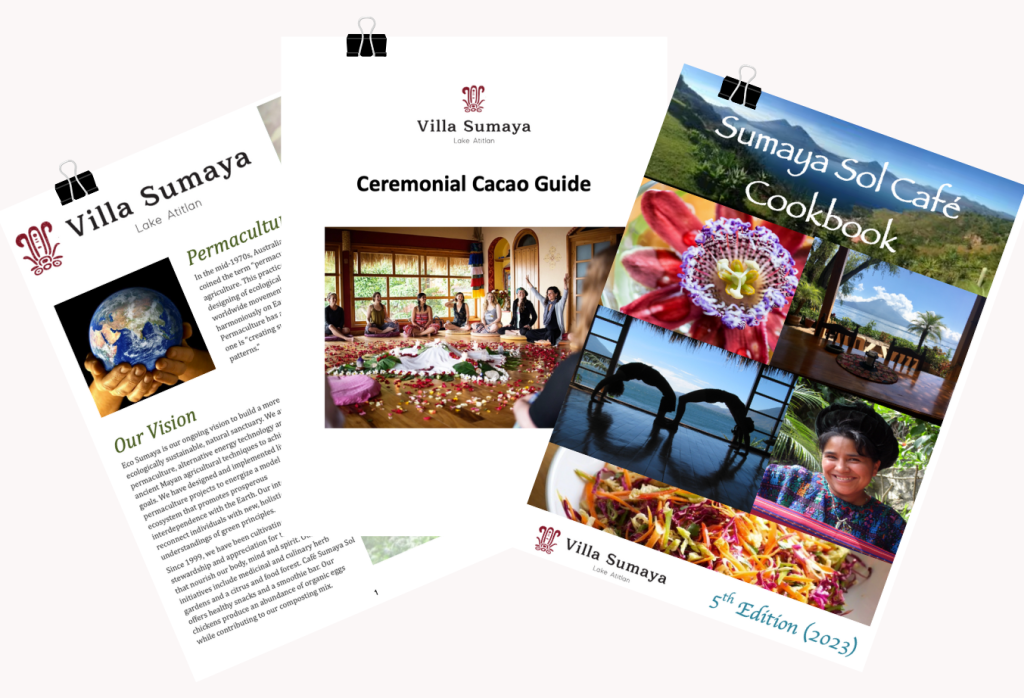 The Sumaya Sol Cookbook is also available in a bundle of THREE ebooks for $15 (plus credit card fee): Sumaya Sol Cookbook, Ceremonial Cacao Guide, and our Eco Sumaya Booklet.